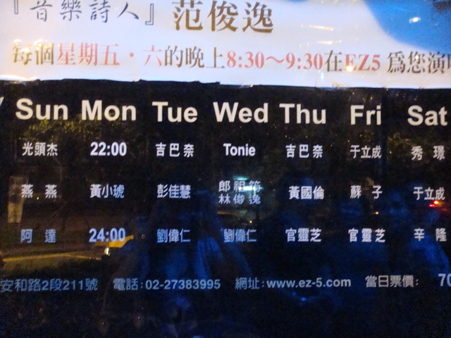 門口貼著當月駐唱的歌手其中有很多藝人 星期一晚上整場都是黃小琥 星期三是彭佳慧