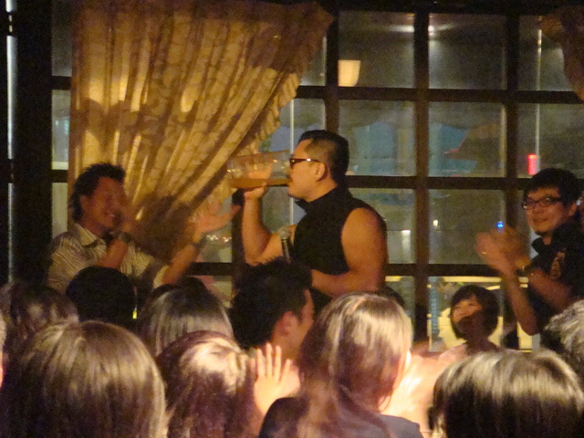 如果可以坐完整首歌 他就送每人一瓶啤酒 如果唱完還可以親一下 全場免費他包